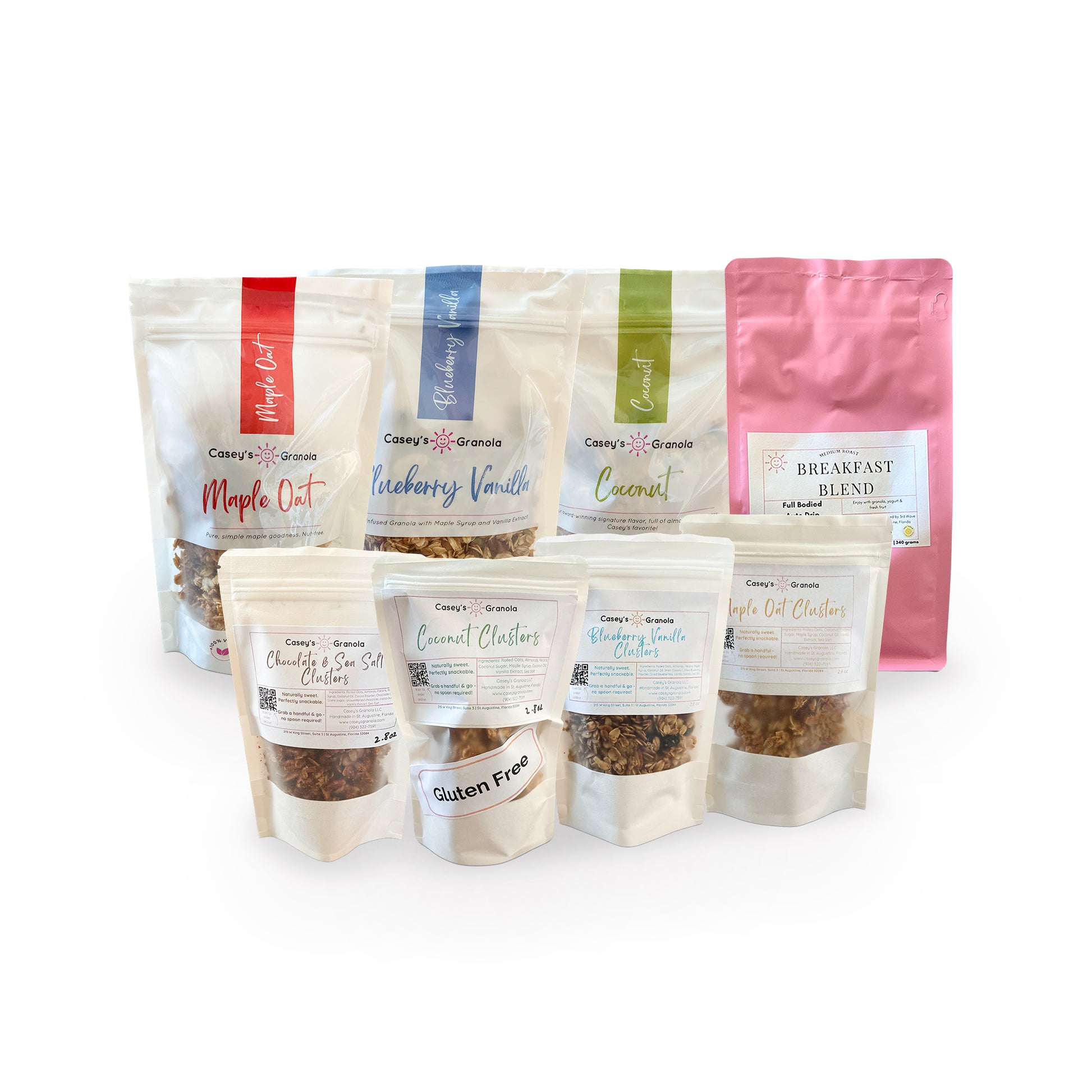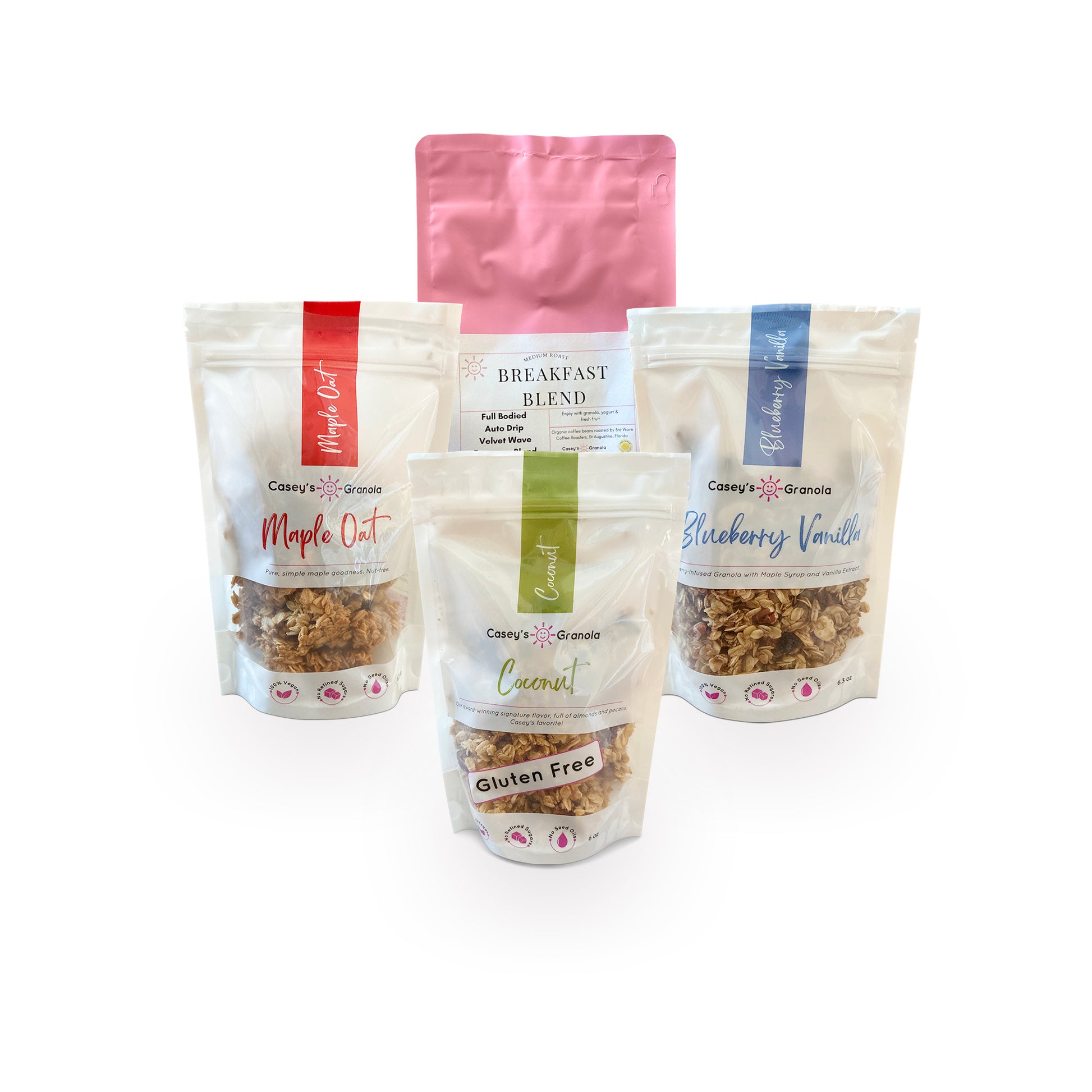 Breakfast Box: Three medium bags of best-selling granola (Blueberry Vanilla, Coconut, Maple Oat) + local organic coffee