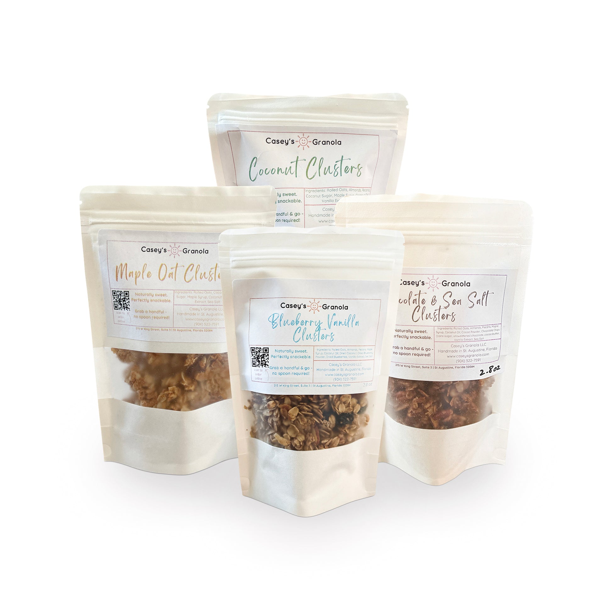 Snack Box: Four snack-size Coconut Clusters: Blueberry Vanilla, Coconut, Maple Oat, and Chocolate & Sea Salt